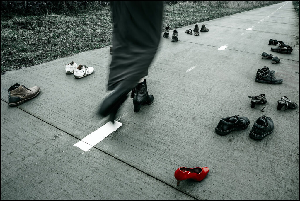 De schoenen dragen de stilte van hen die corona niet overleefden.